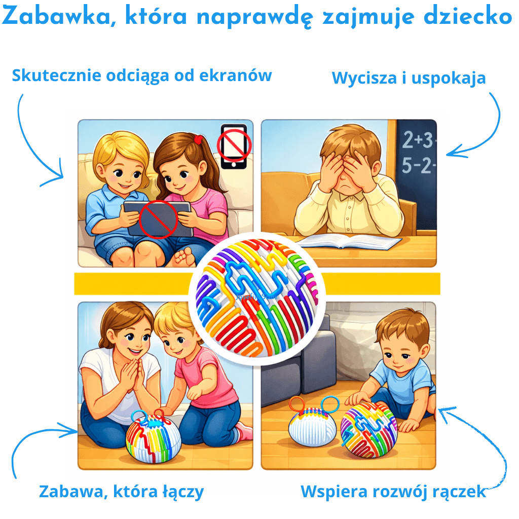 Idealna odskocznia od ekranów zabawka jest świetną alternatywą dla tabletu czy telefonu. Angażuje wzrok i dłonie w sposób fizyczny, co pozwala odpocząć przebodźcowanemu cyfrowo umysłowi.