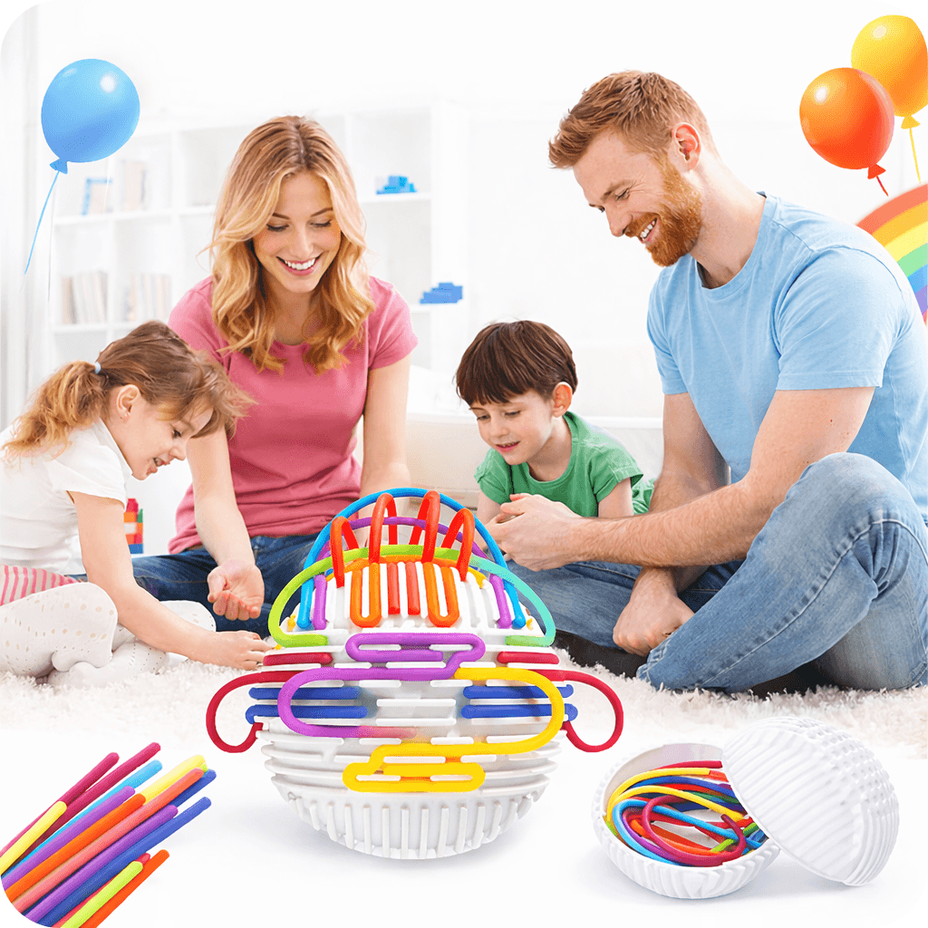 Zabawa, która łączy: Dzięki temu, że kulę można rozłożyć na dwie części, zabawka promuje interakcje społeczne. Dzieci mogą bawić się razem lub z rodzicem, ucząc się dzielenia i wspólnego rozwiązywania „sznurkowych zagadek”.